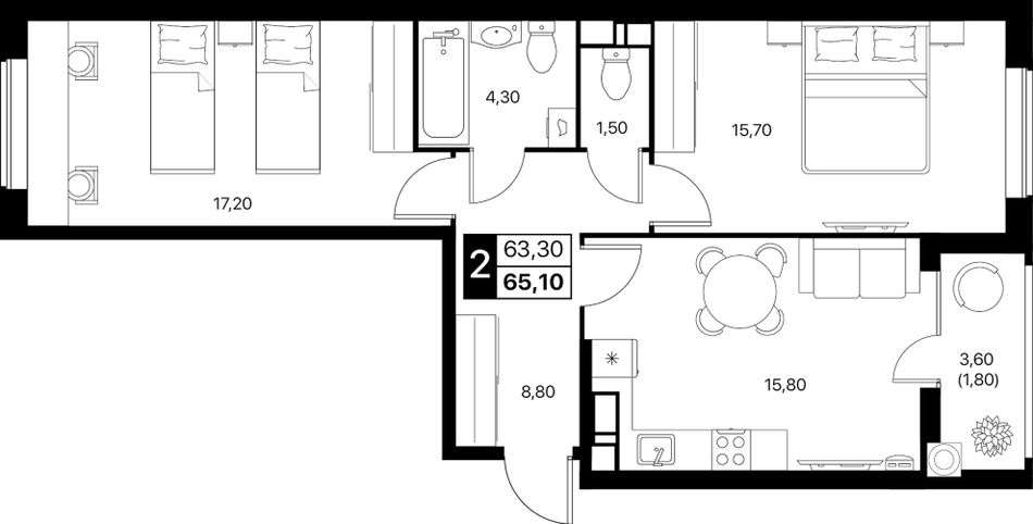 2-комнатная — 65,1 м² 9/12 эт. в Квартал впечатлений Эстет