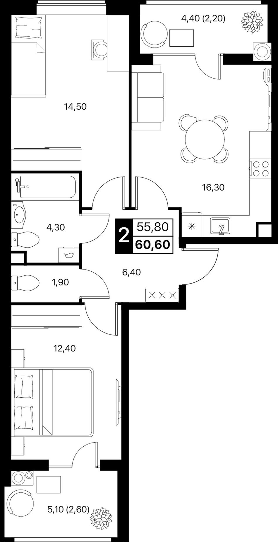 2-комнатная — 60,6 м² 2/12 эт. в Квартал впечатлений Эстет
