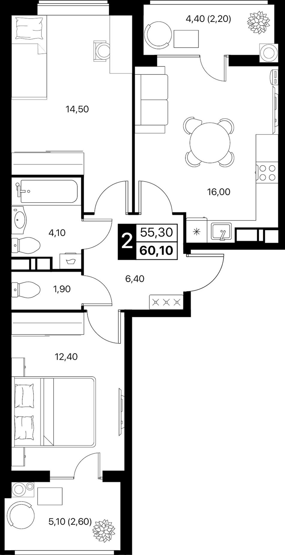2-комнатная — 60,1 м² 3/12 эт. в Квартал впечатлений Эстет