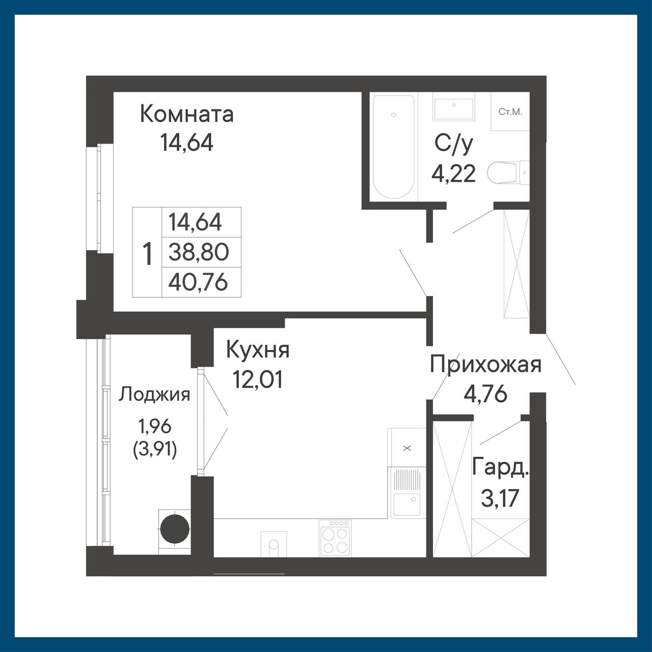 1-комнатная — 40,76 м² 5/8 эт. в Ривьера