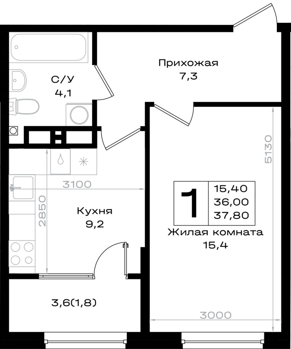 1-комнатная — 37,8 м² 4/18 эт. в Придонье