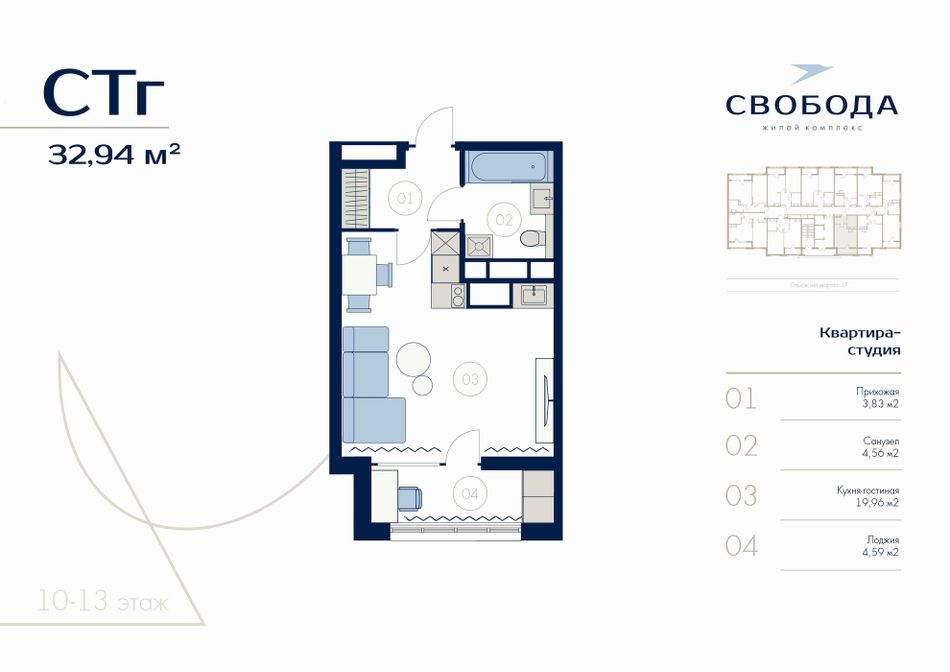 Студия — 32,94 м² 12/19 эт. в Свобода