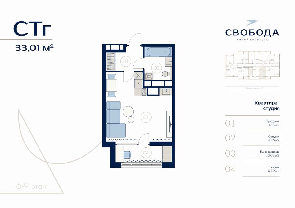 Студия — 33,01 м² 9/19 эт. в Свобода