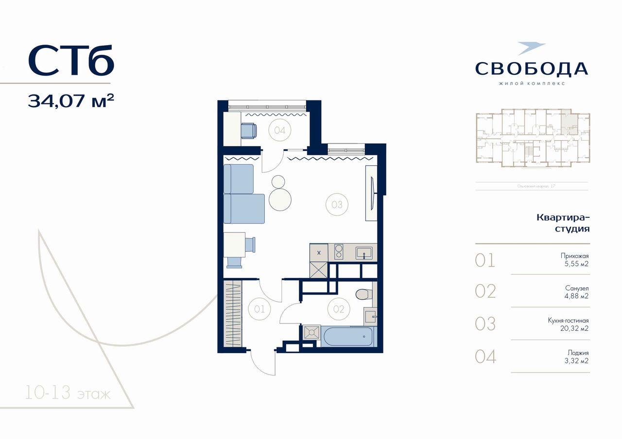 Студия — 34,07 м² 11/19 эт. в Свобода