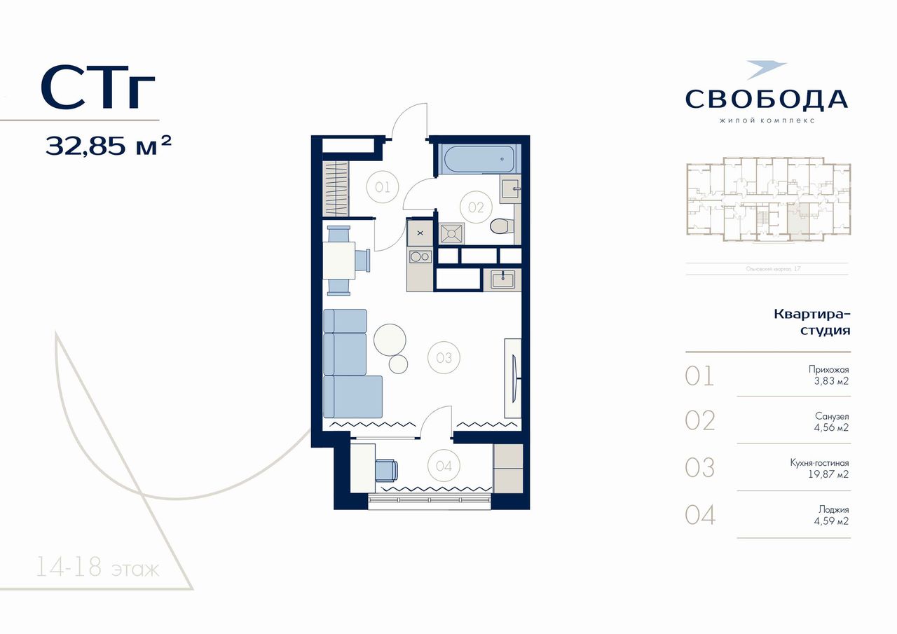 Студия — 32,85 м² 16/19 эт. в Свобода