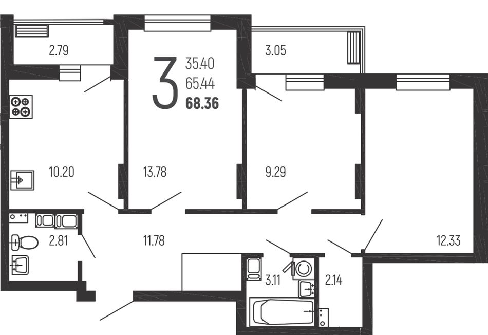 3-комнатная — 68,36 м² 9/14 эт. в Нахимовский