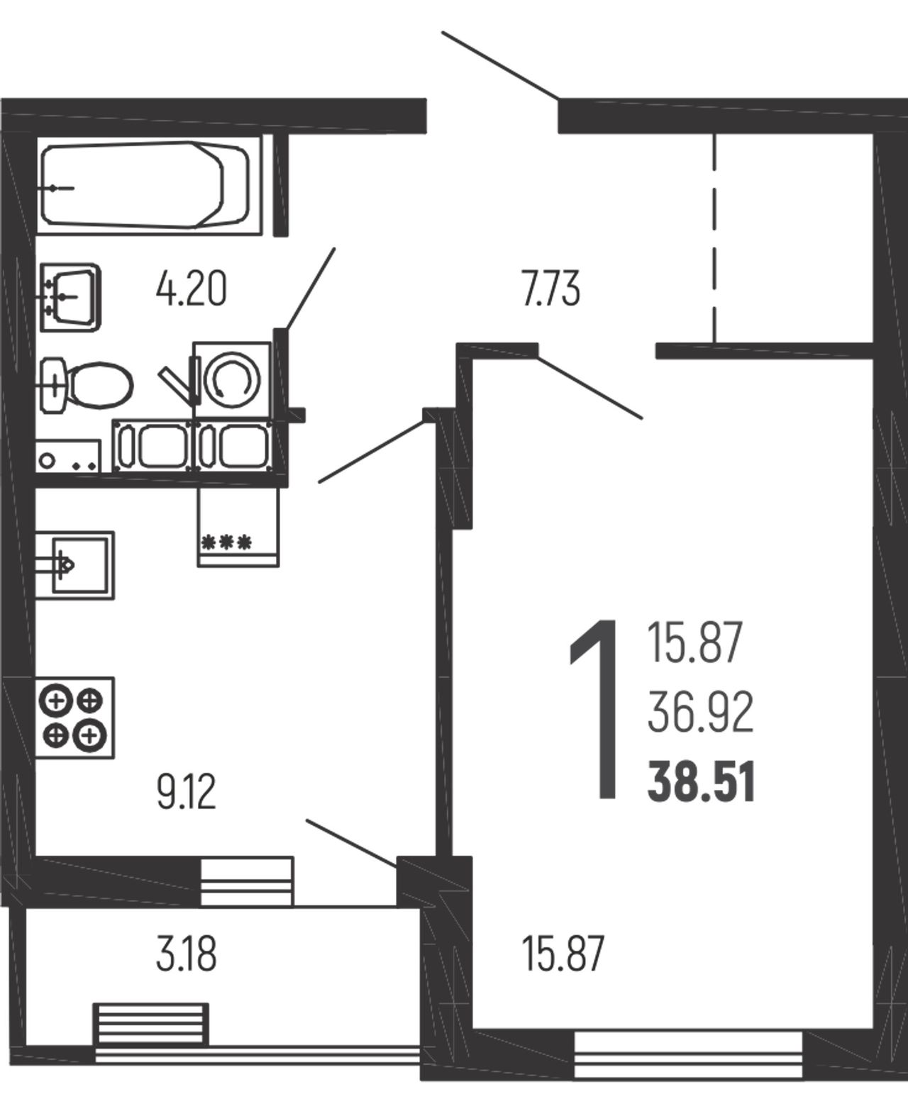 1-комнатная — 38,51 м² 3/9 эт. в Нахимовский