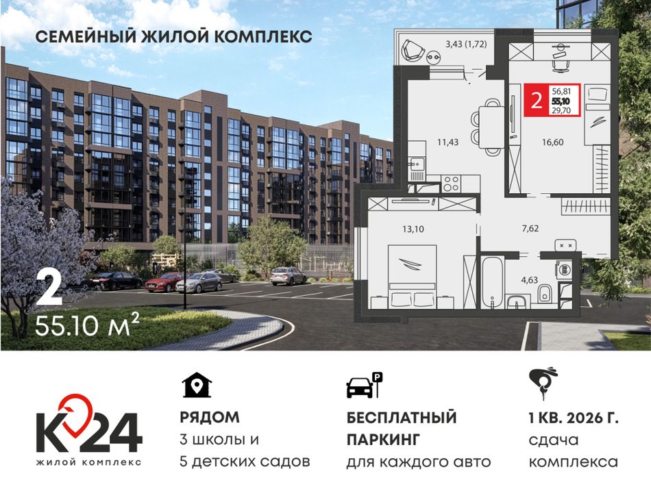 Ищете дом, где соседи знают друг друга в лицо, а во дворе всегда есть место для машины? Добро пожаловать в «К24» — жилой комплекс комфорт-класса, созданный специально для семейной жизни. Сдача комплекса уже в марте!