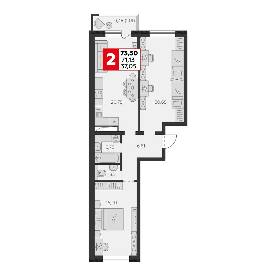 3-комнатная — 71,13 м² 3/9 эт. в К24
