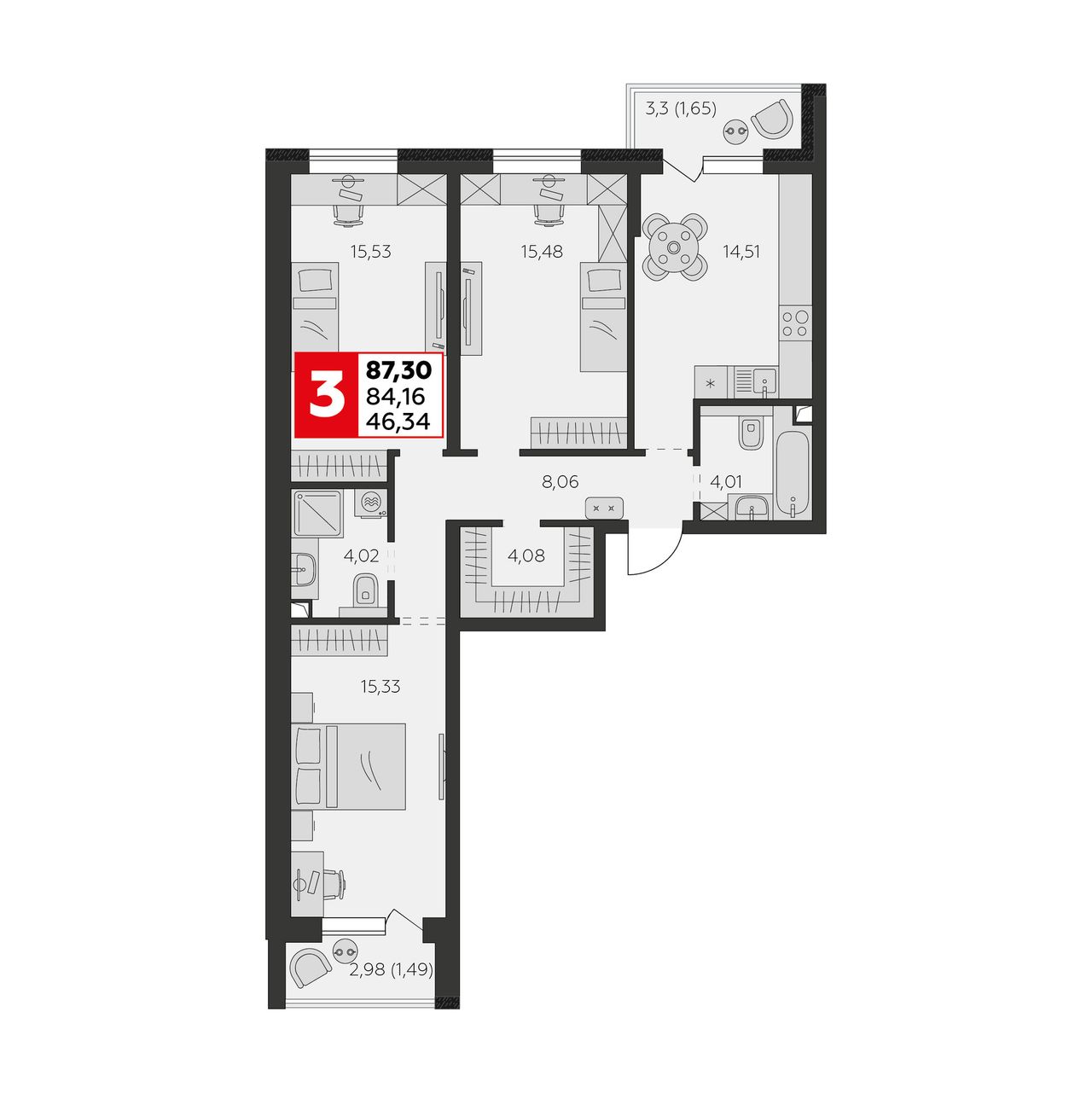 3-комнатная — 84,16 м² 2/9 эт. в К24