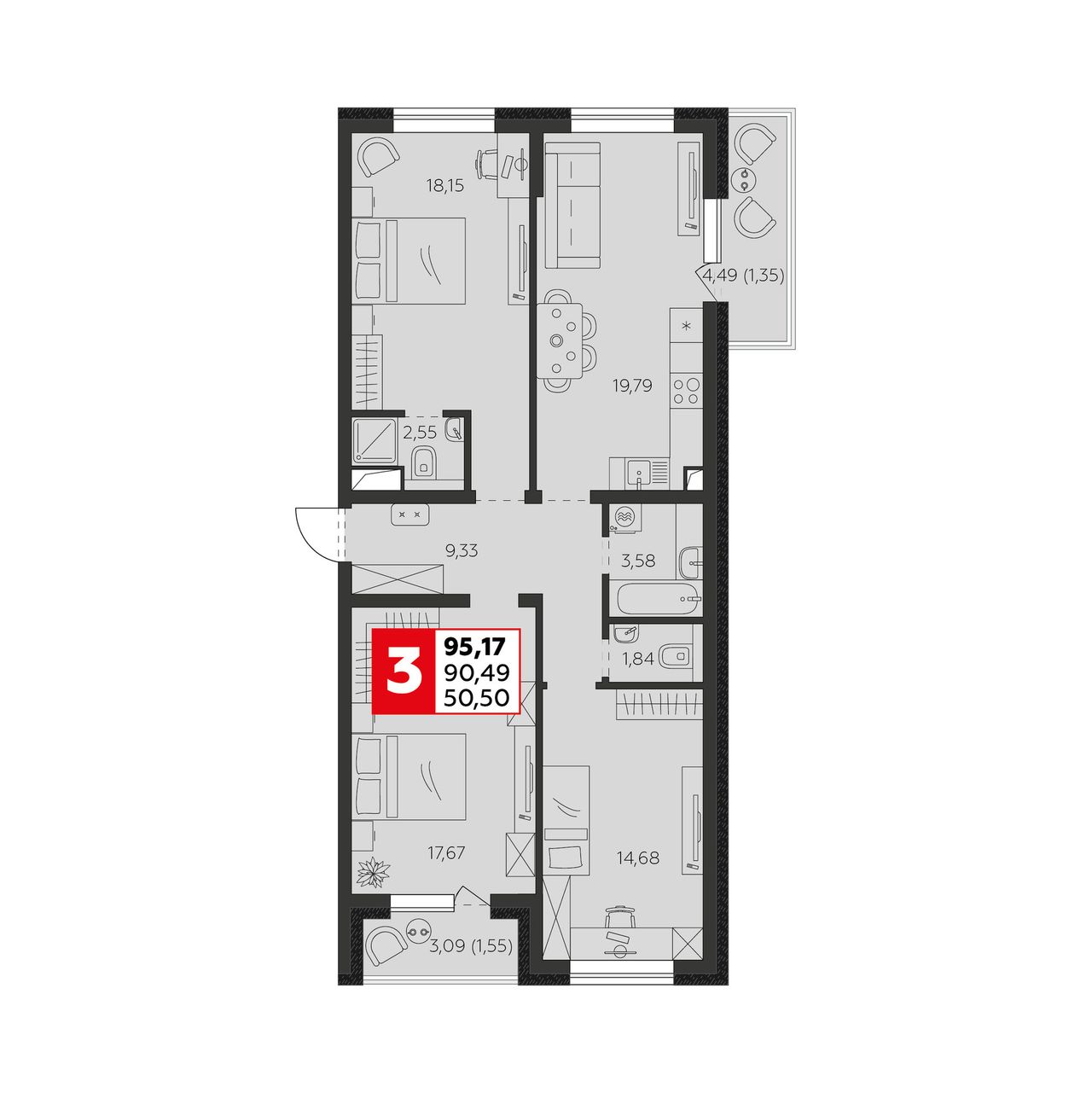 Общая площадь90,49 м²