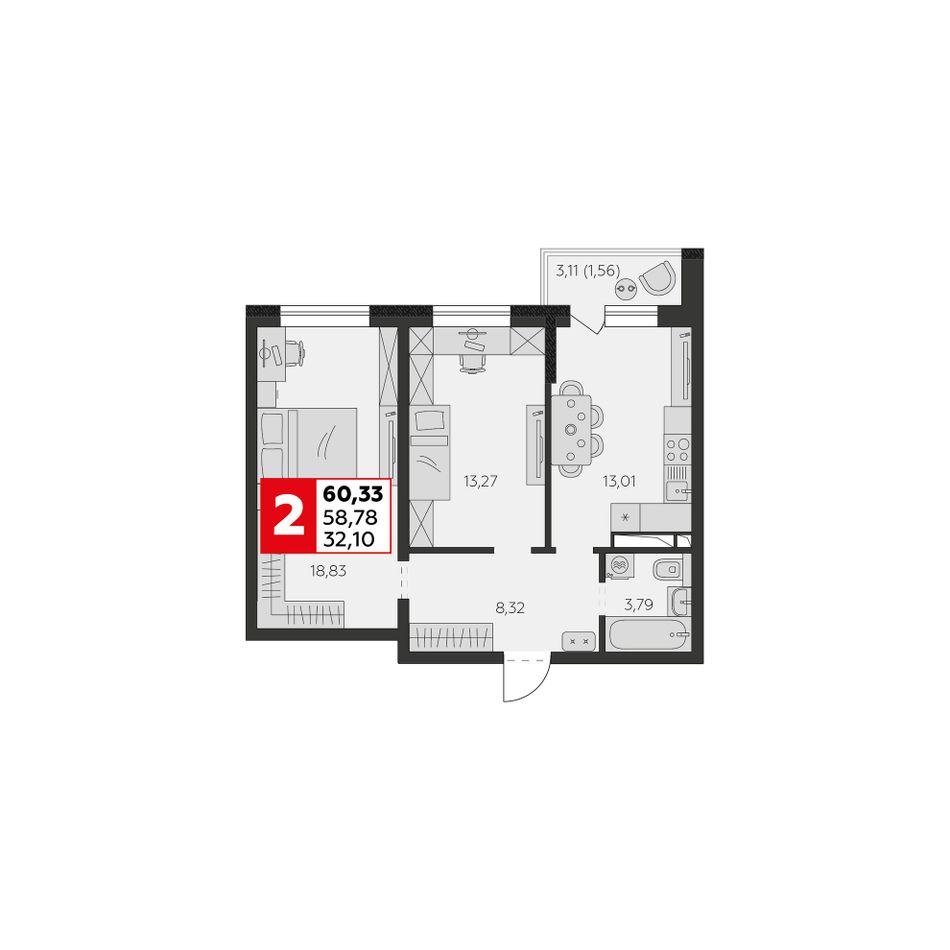 2-комнатная — 58,78 м² 3/9 эт. в К24