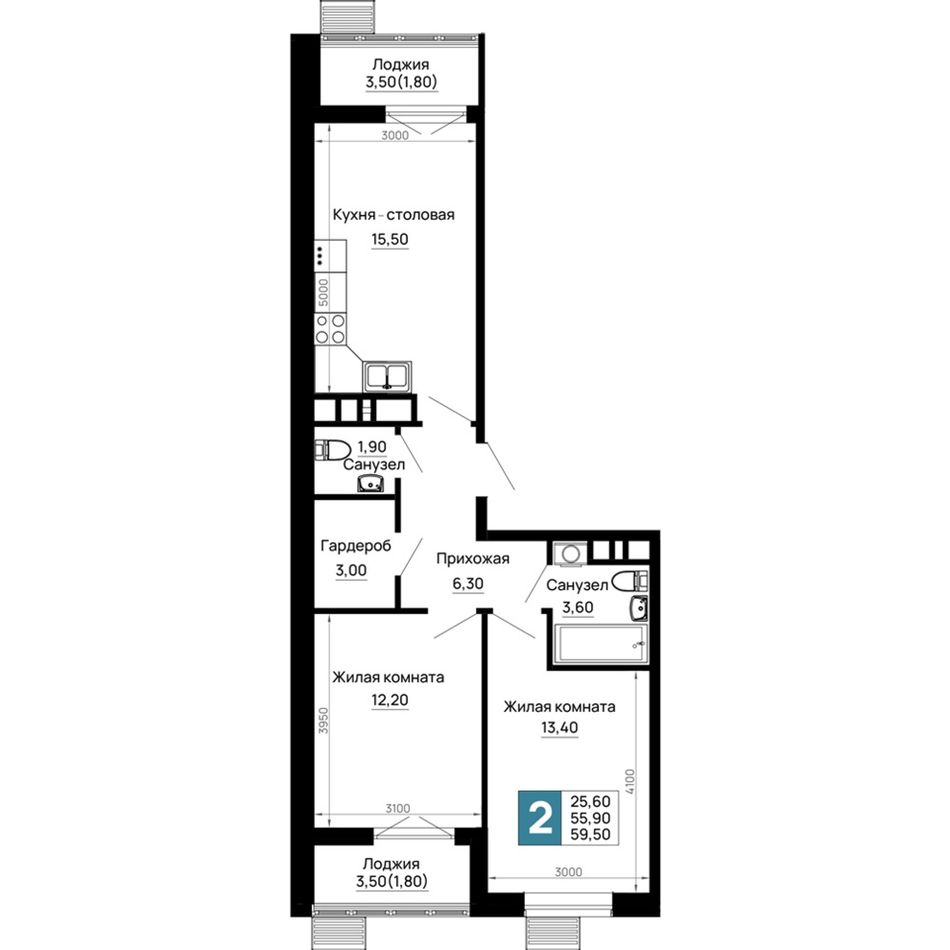 Общая площадь59,5 м²