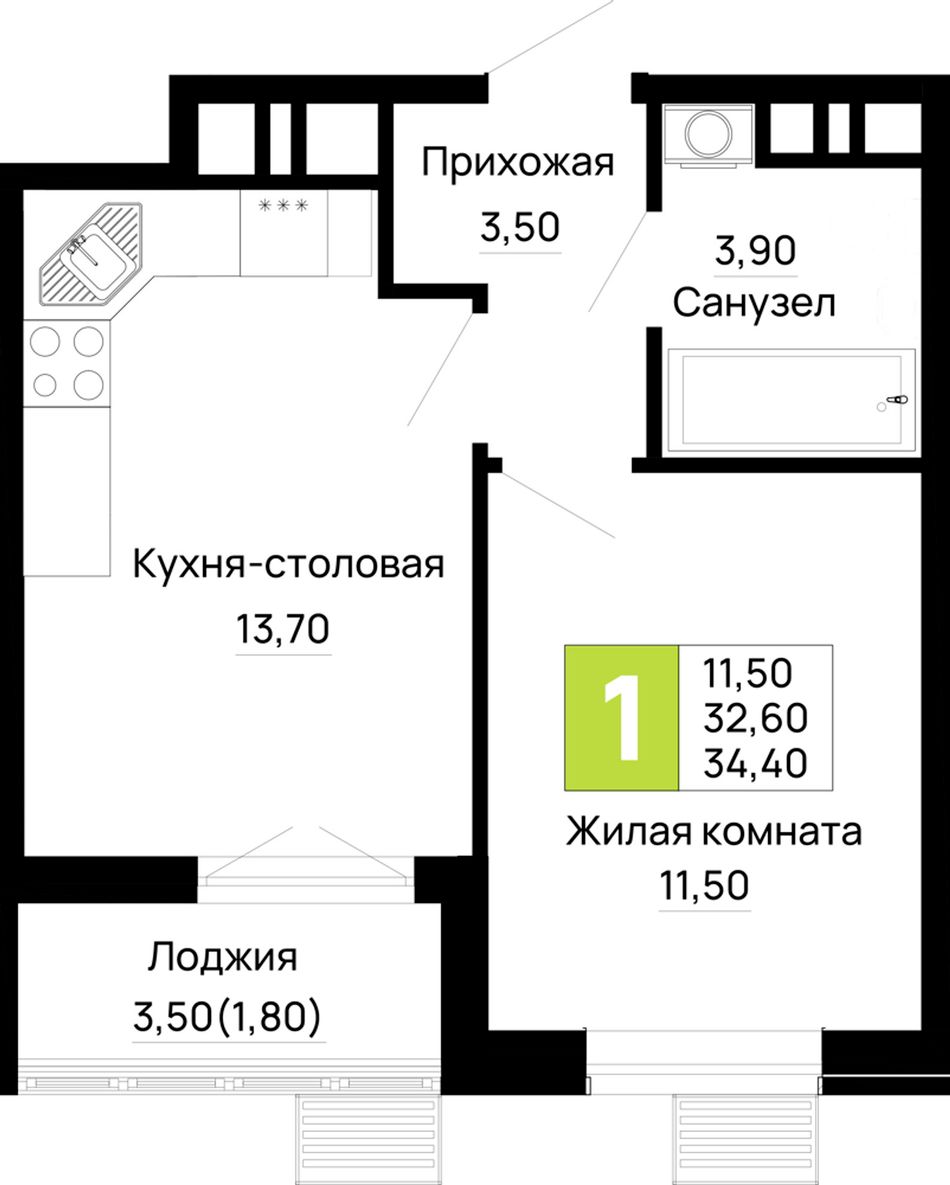 1-комнатная — 34,4 м² 9/16 эт. в Традиции