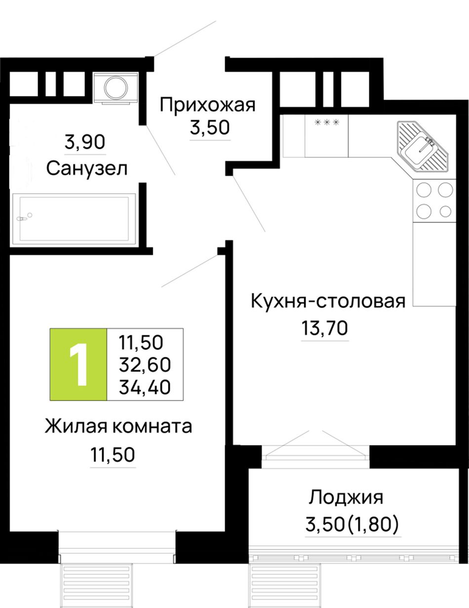 1-комнатная — 34,4 м² 8/16 эт. в Традиции