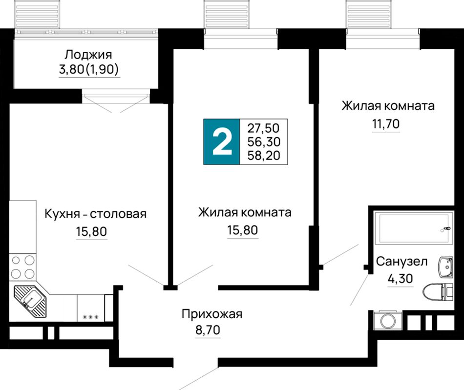 2-комнатная — 58,2 м² 15/16 эт. в Традиции