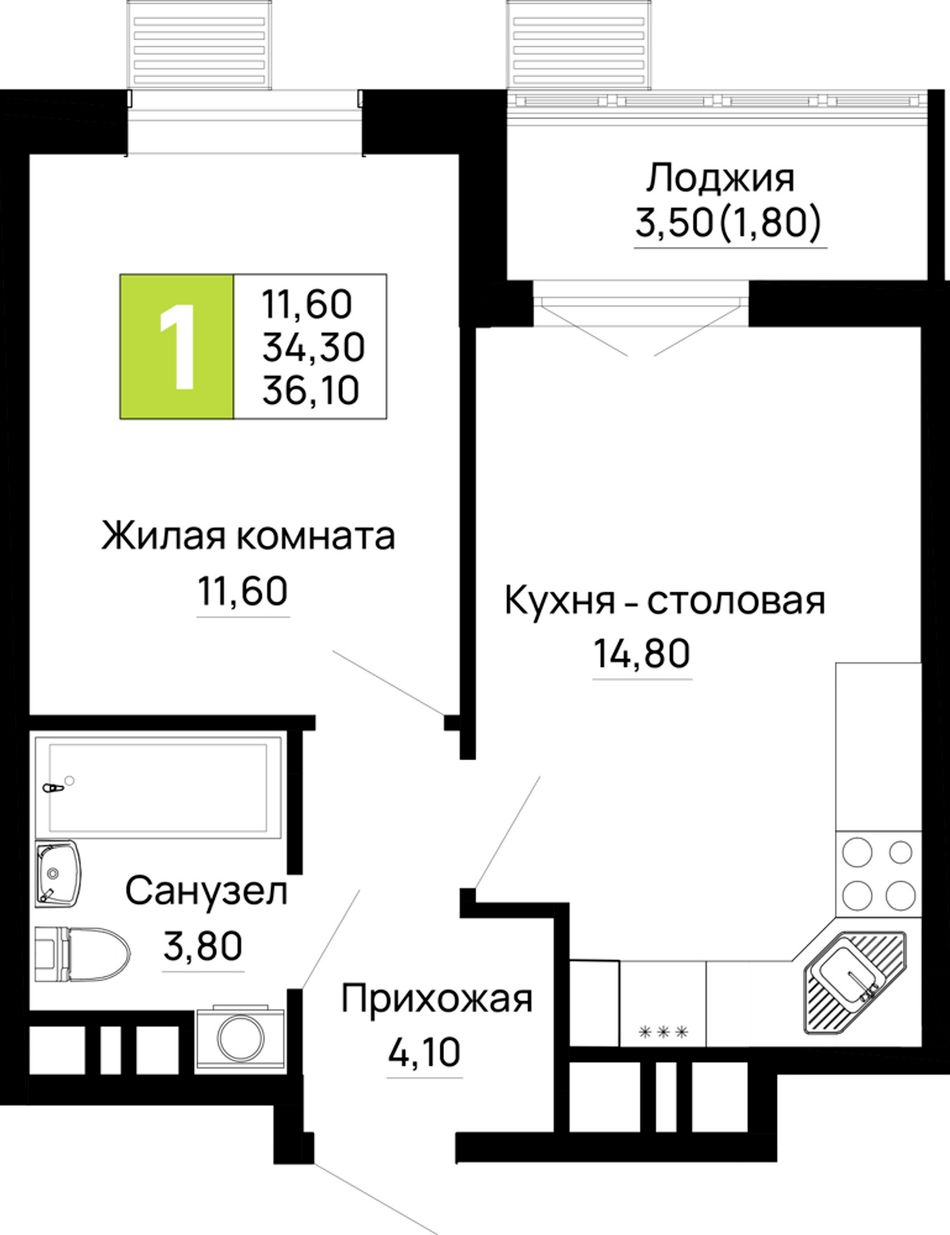 1-комнатная — 36,1 м² 16/16 эт. в Традиции