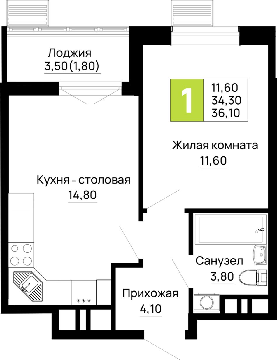 1-комнатная — 36,1 м² 13/16 эт. в Традиции