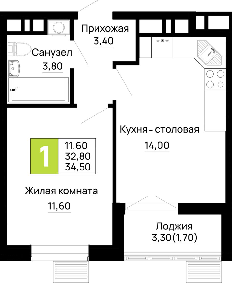 1-комнатная — 34,5 м² 9/16 эт. в Традиции