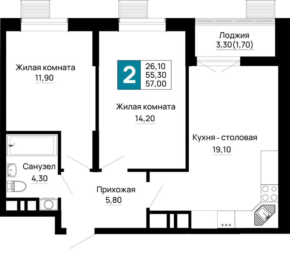 2-комнатная — 57 м² 15/16 эт. в Традиции