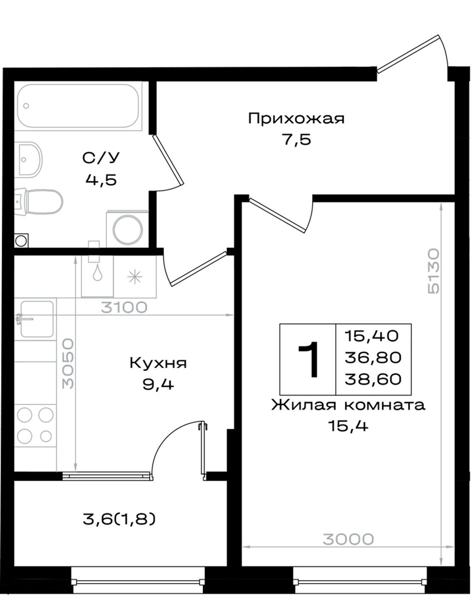 1-комнатная — 38,6 м² 2/18 эт. в Придонье