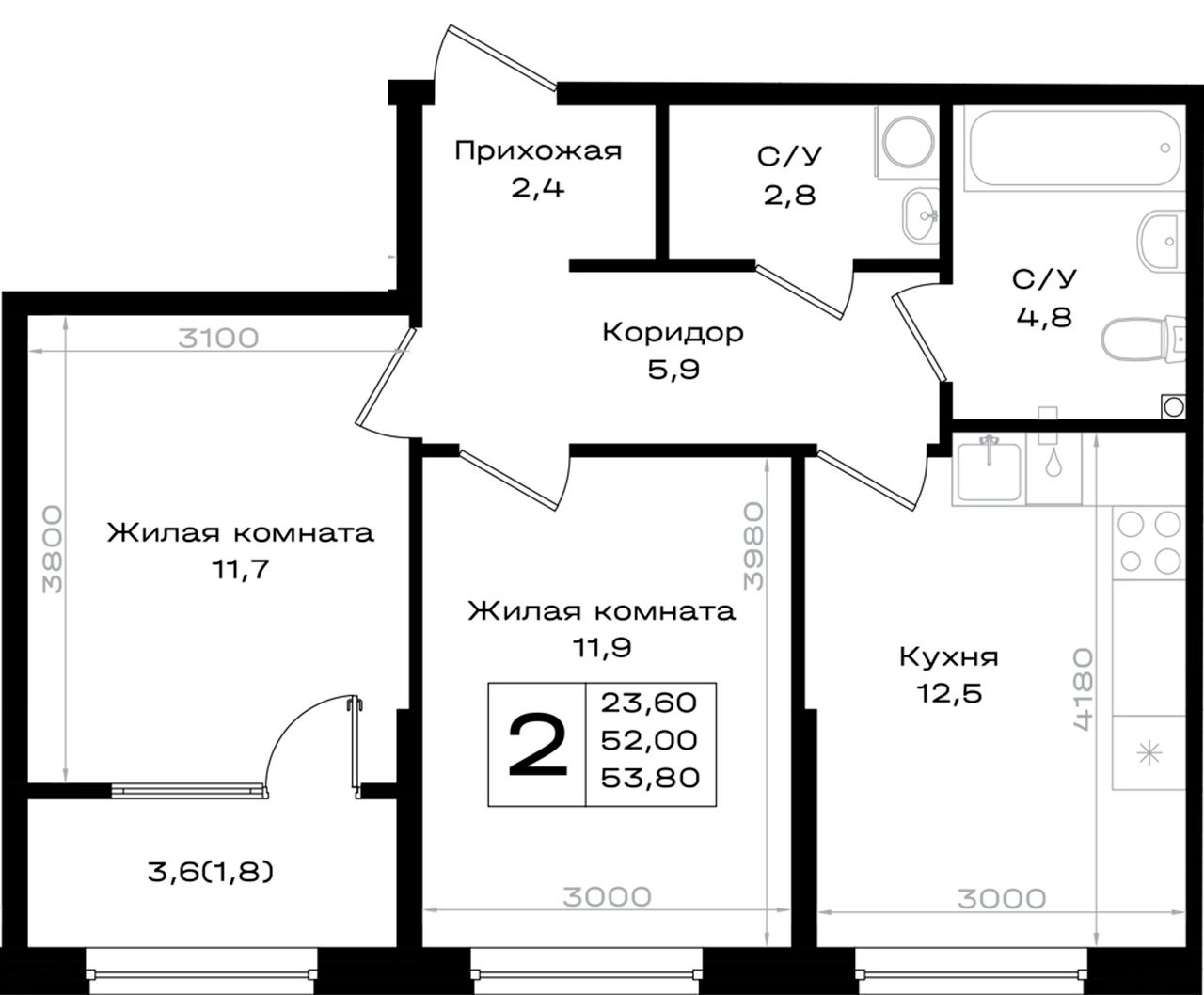 Общая площадь53,8 м²