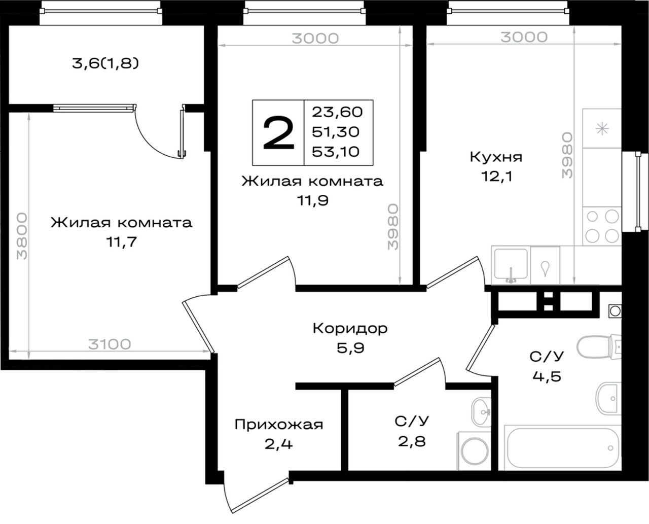 2-комнатная — 53,1 м² 15/18 эт. в Придонье