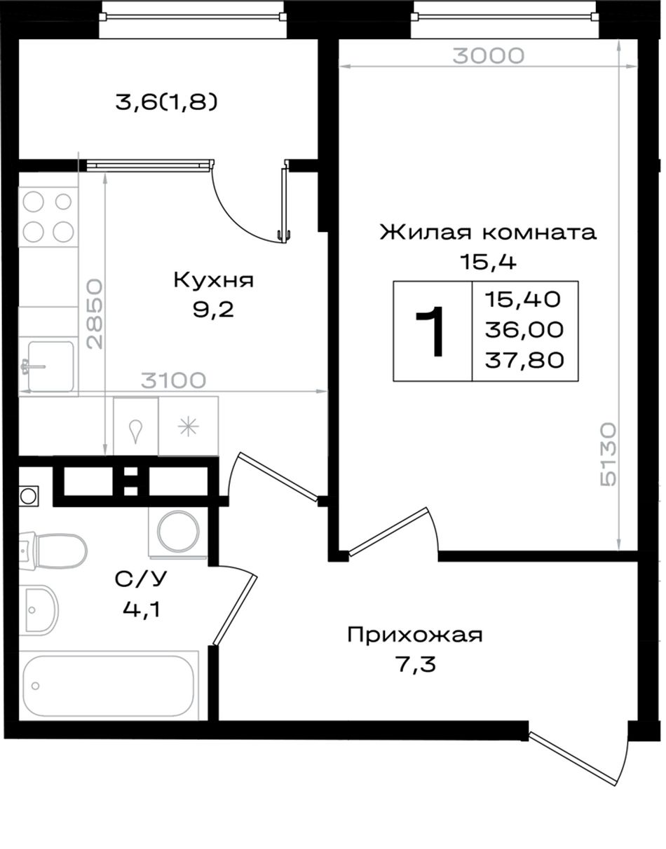 1-комнатная — 37,8 м² 14/18 эт. в Придонье