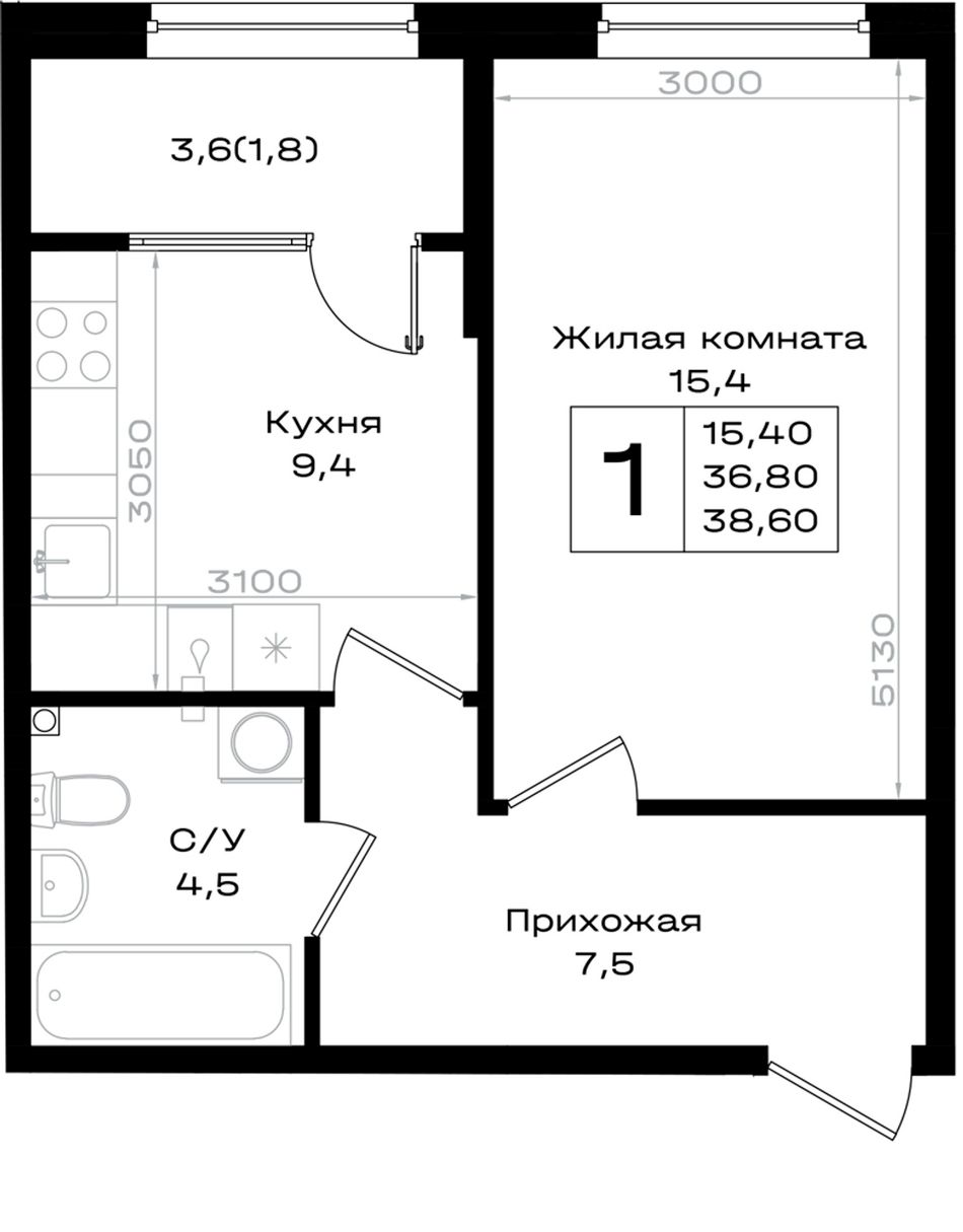 1-комнатная — 38,6 м² 2/18 эт. в Придонье