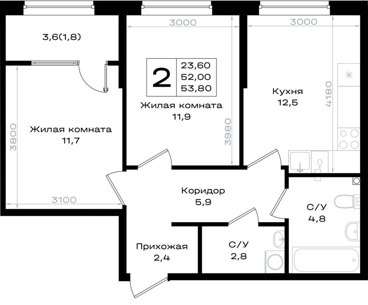2-комнатная — 53,8 м² 2/18 эт. в Придонье