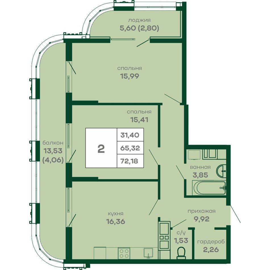 2-комнатная — 72,18 м² 13/17 эт. в СкайПАРК