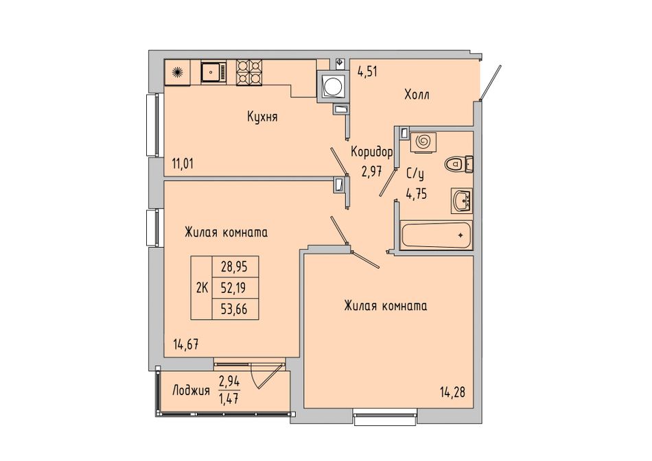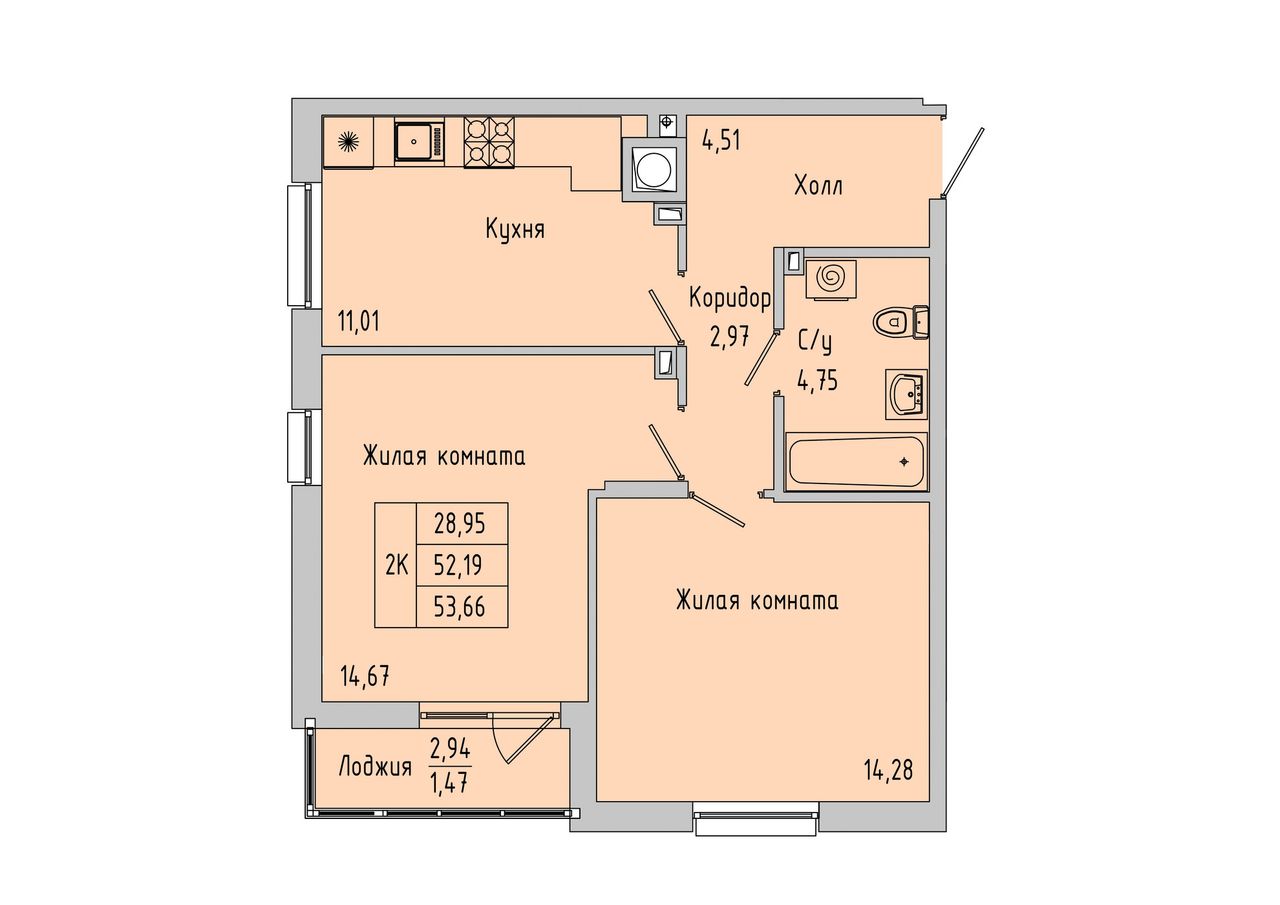 2-комнатная — 53,66 м² 1/10 эт. в Пальмира 2.0