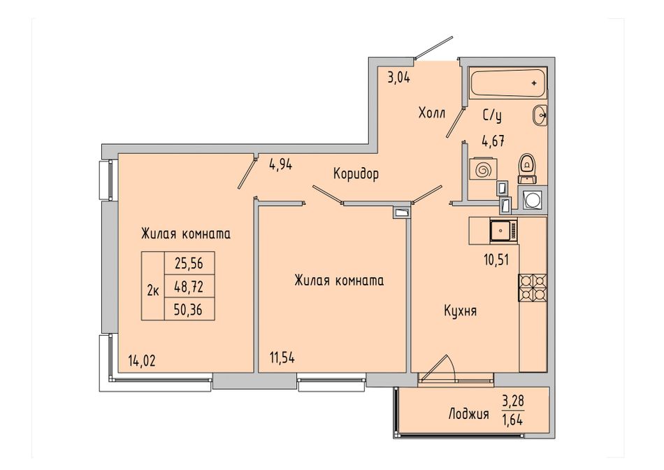 2-комнатная — 50,36 м² 1/7 эт. в Пальмира 2.0