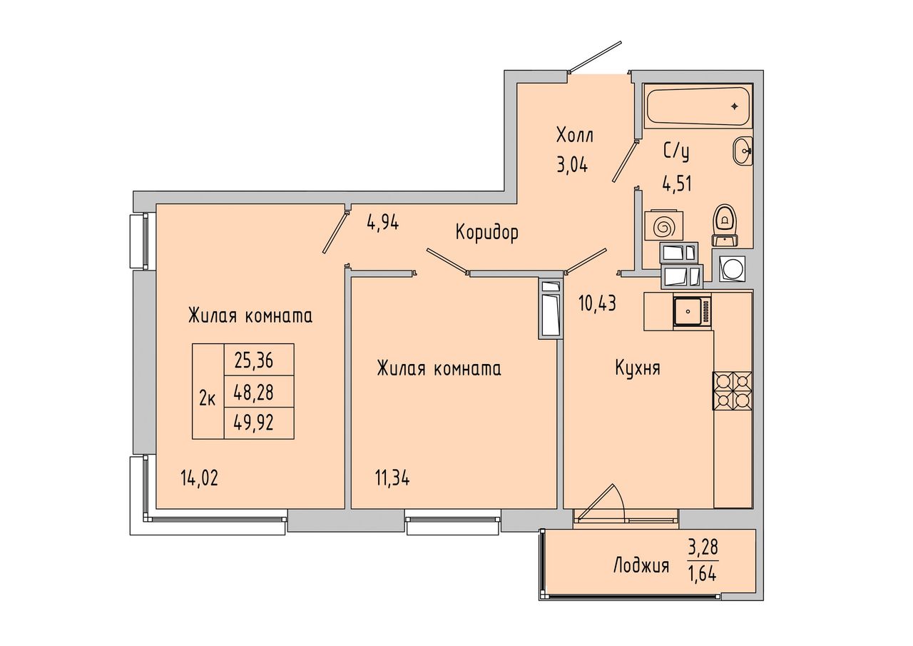2-комнатная — 49,92 м² 3/7 эт. в Пальмира 2.0