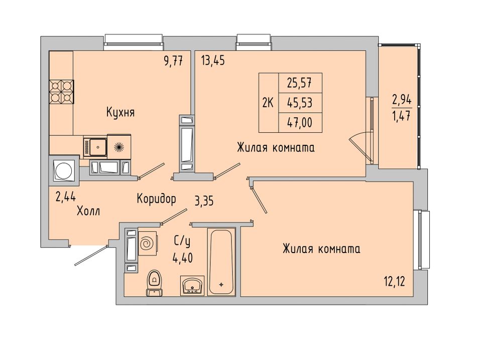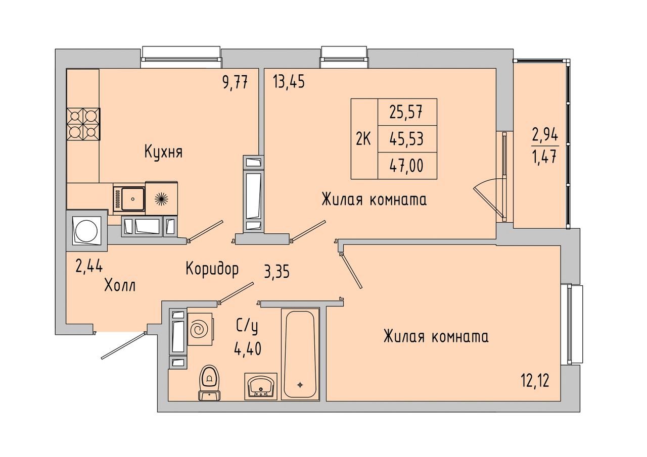2-комнатная — 47 м² 10/10 эт. в Пальмира 2.0