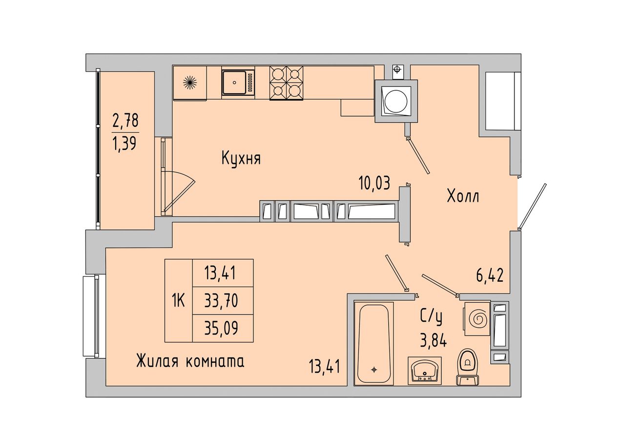 1-комнатная — 35,09 м² 10/10 эт. в Пальмира 2.0