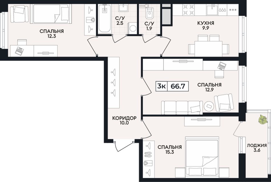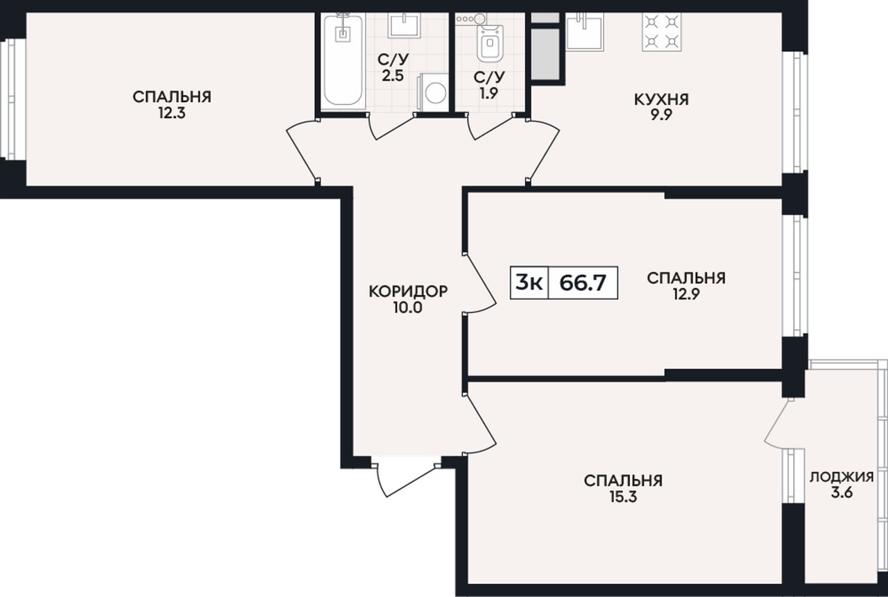3-комнатная — 66,7 м² 8/9 эт. в Горизонт