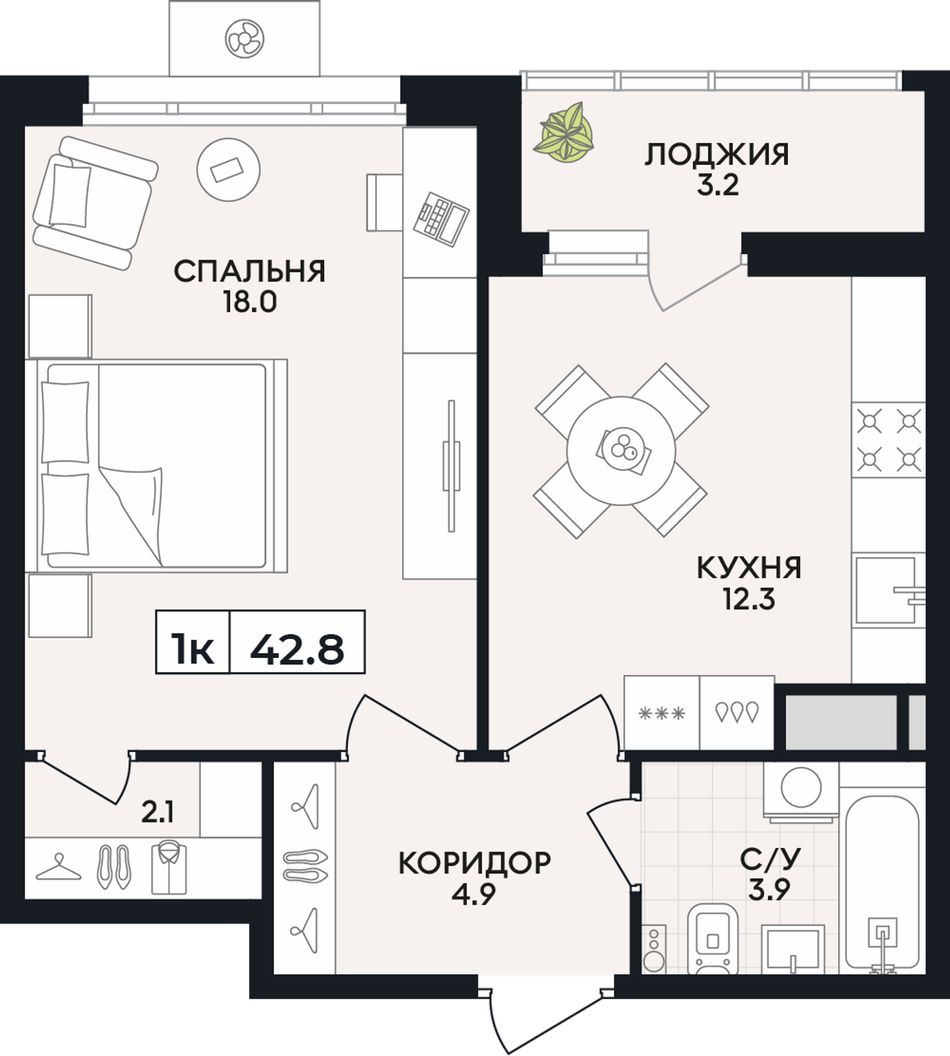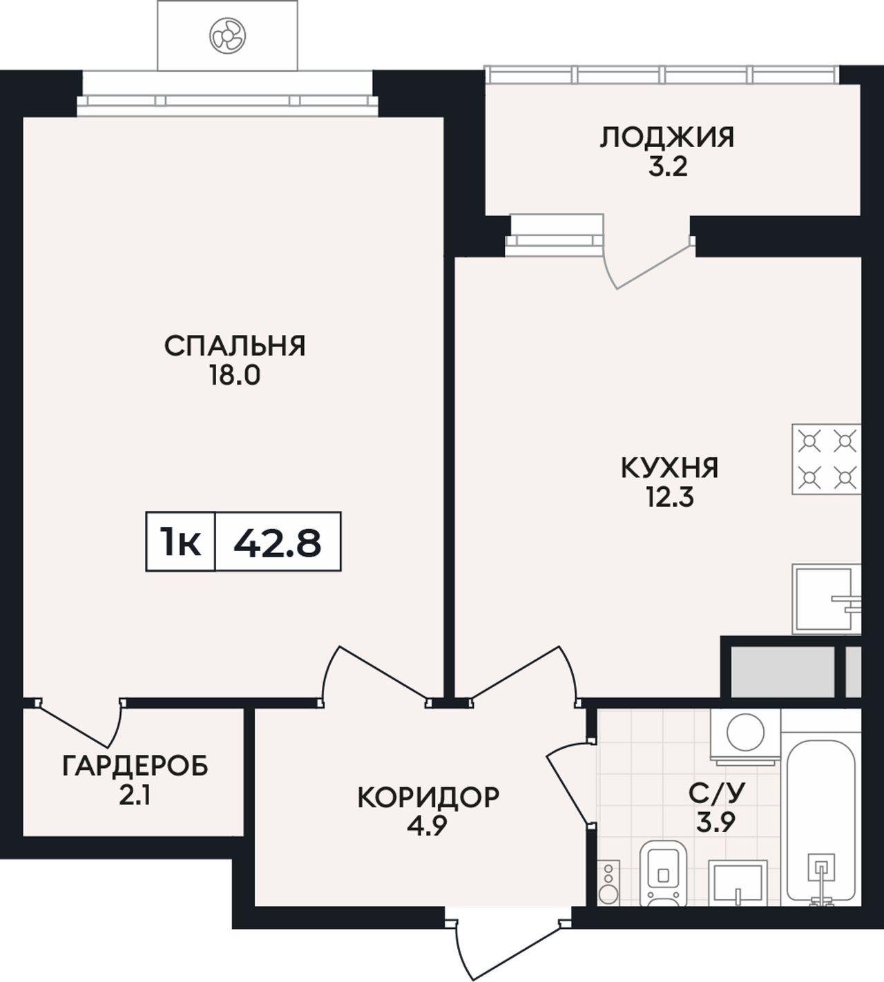 1-комнатная — 42,8 м² 6/9 эт. в Горизонт
