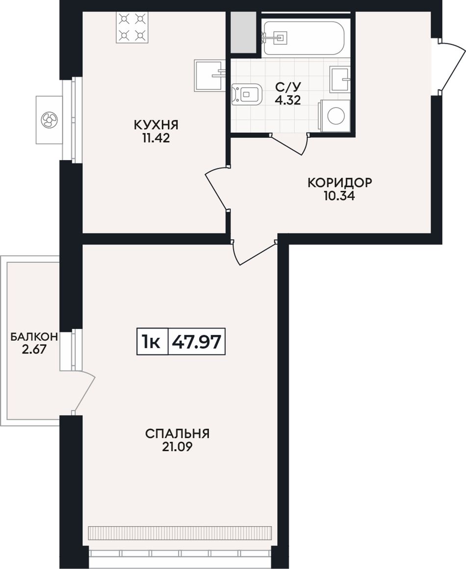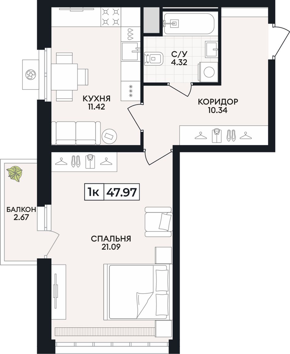 1-комнатная — 47,97 м² 14/15 эт. в Кипарис