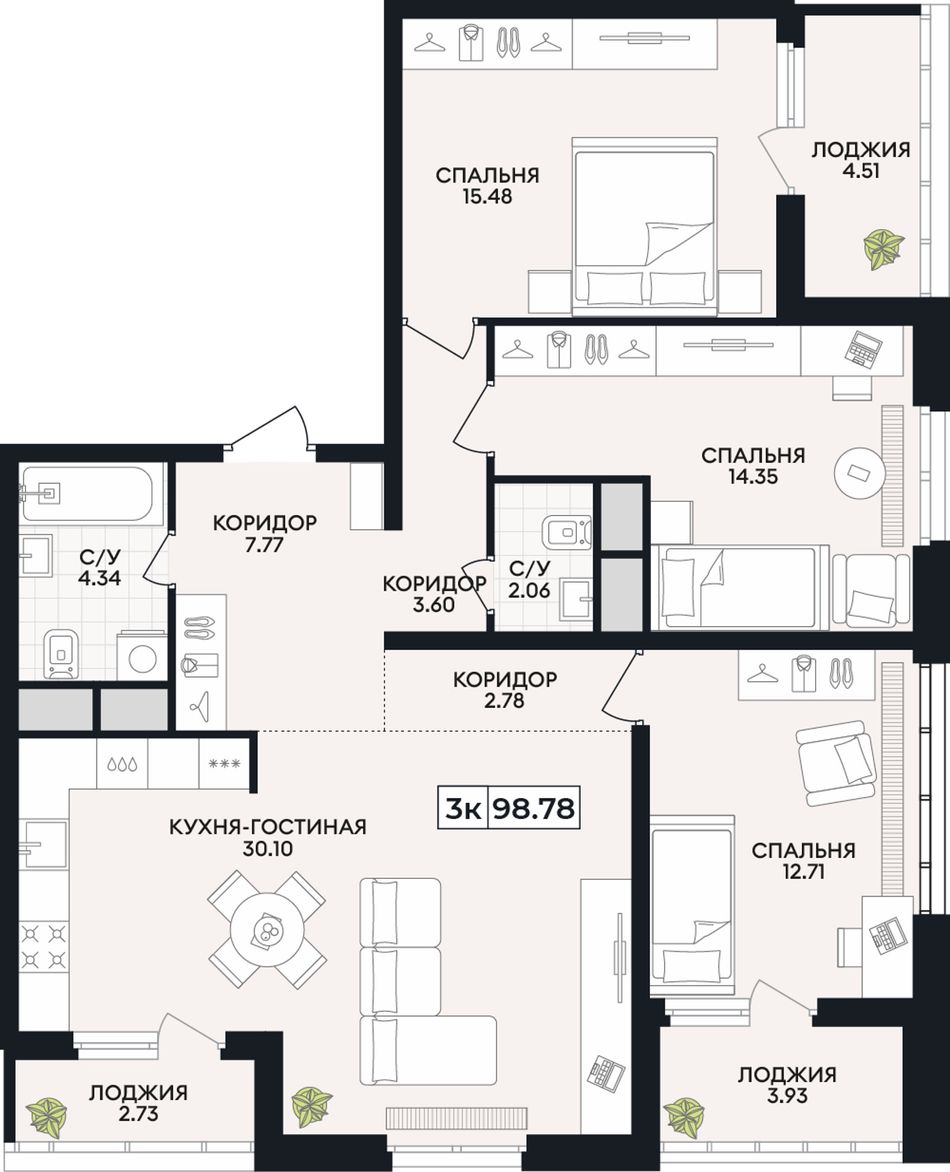 3-комнатная — 98,78 м² 15/15 эт. в Кипарис