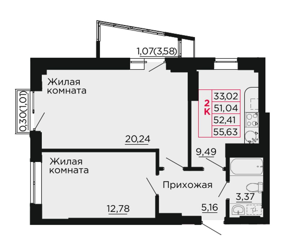 2-комнатная — 52,8 м² 7/10 эт. в Вишнёвый сад