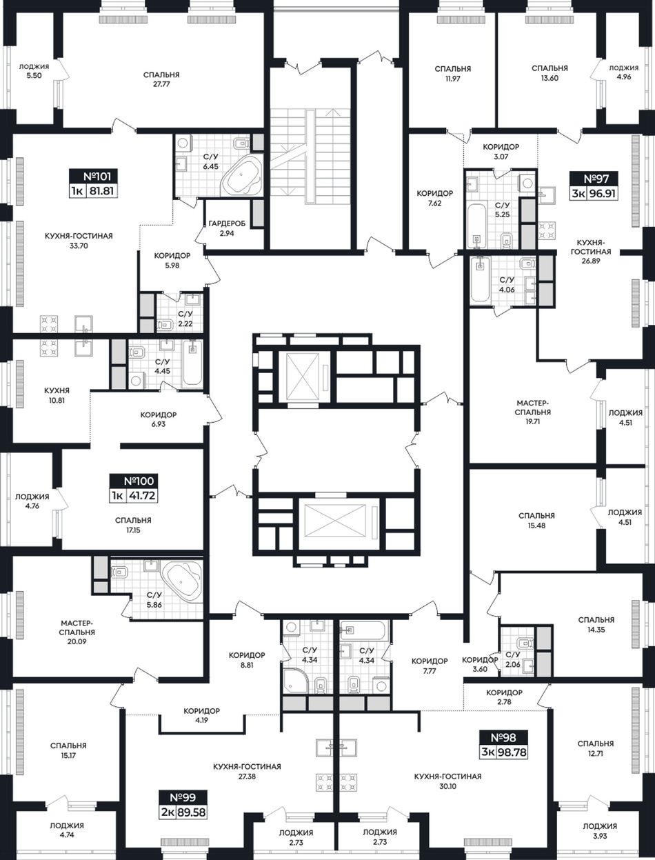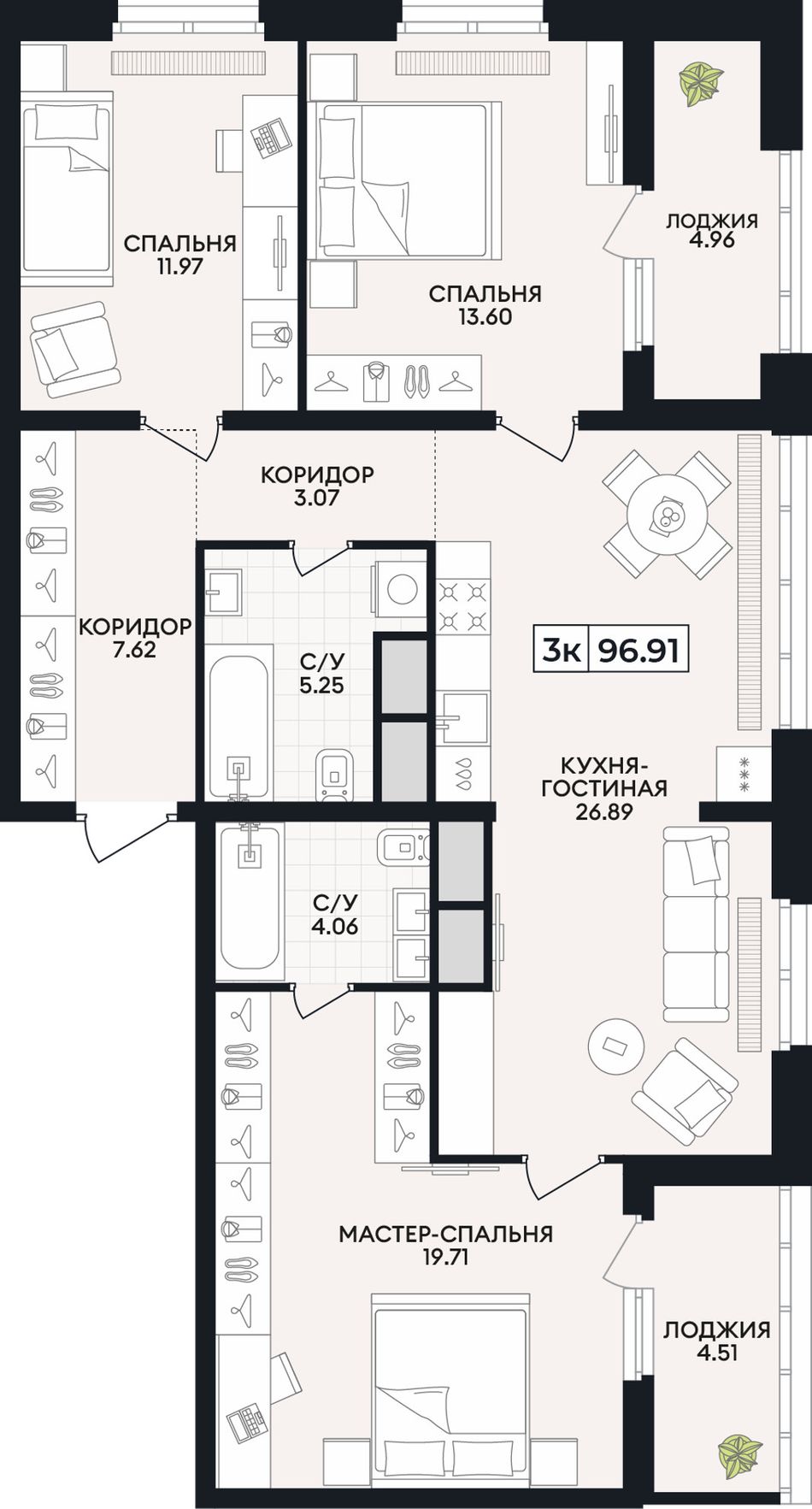 3-комнатная — 96,91 м² 15/15 эт. в Кипарис