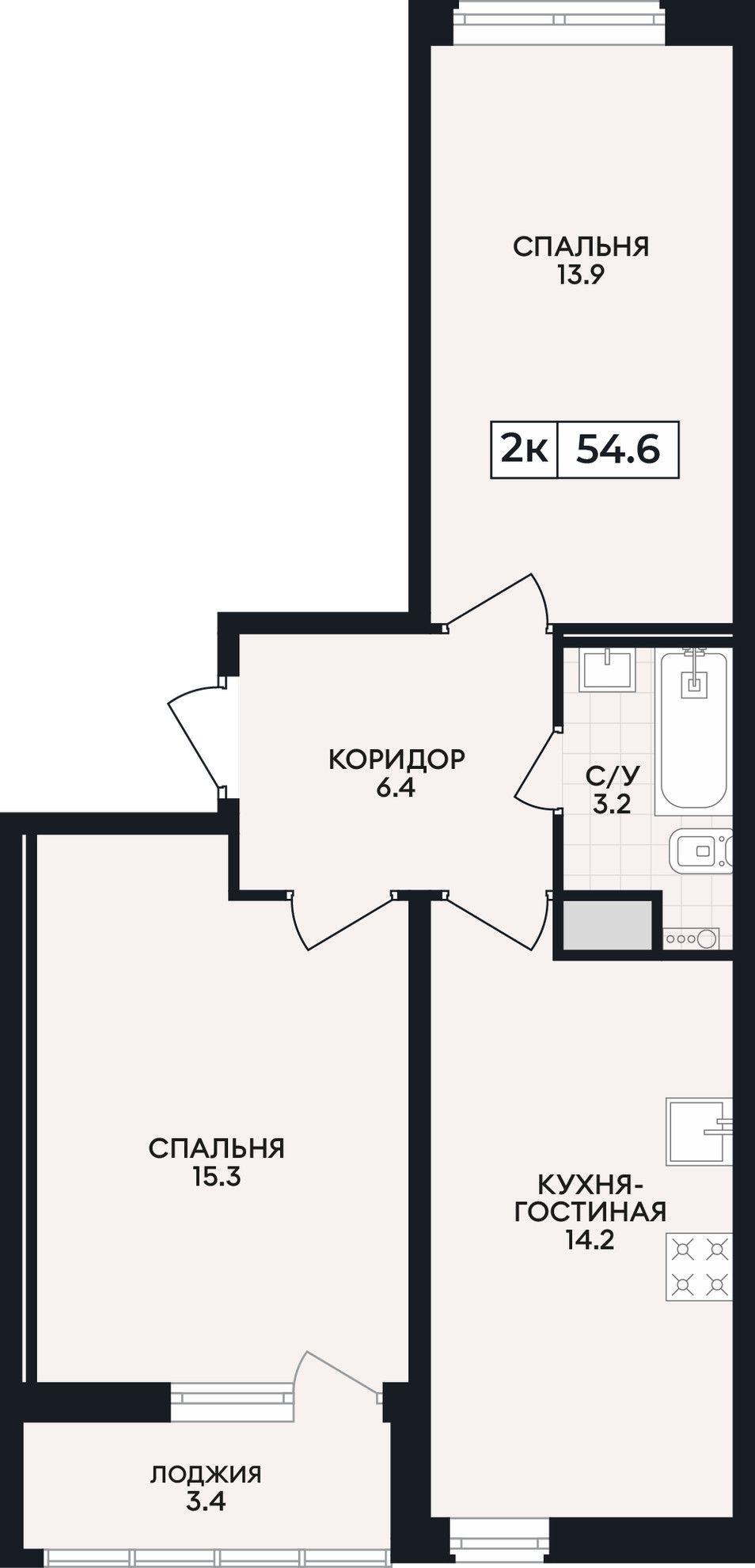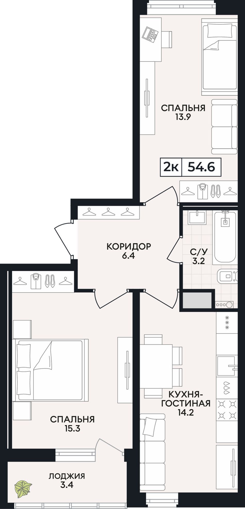 2-комнатная — 54,6 м² 2/9 эт. в Горизонт
