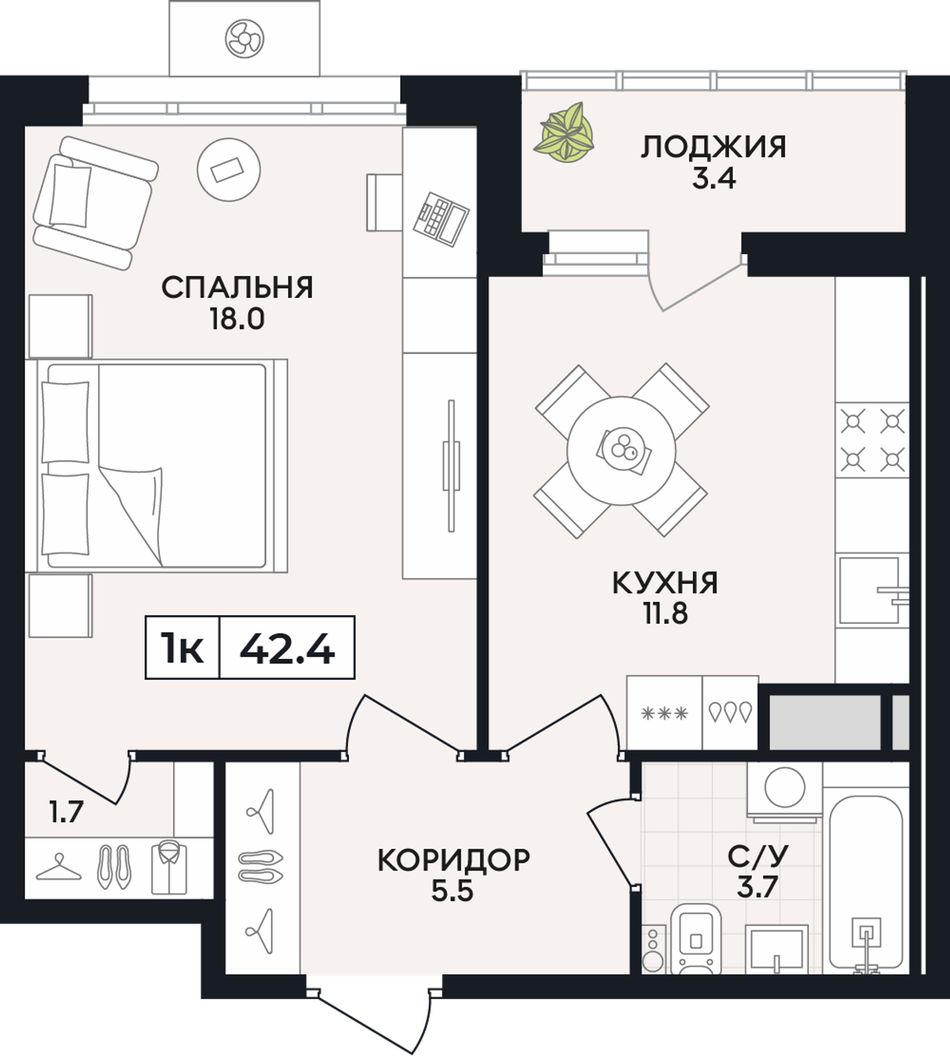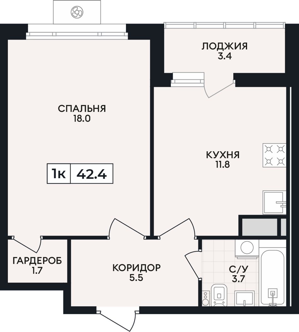 1-комнатная — 42,4 м² 5/9 эт. в Горизонт