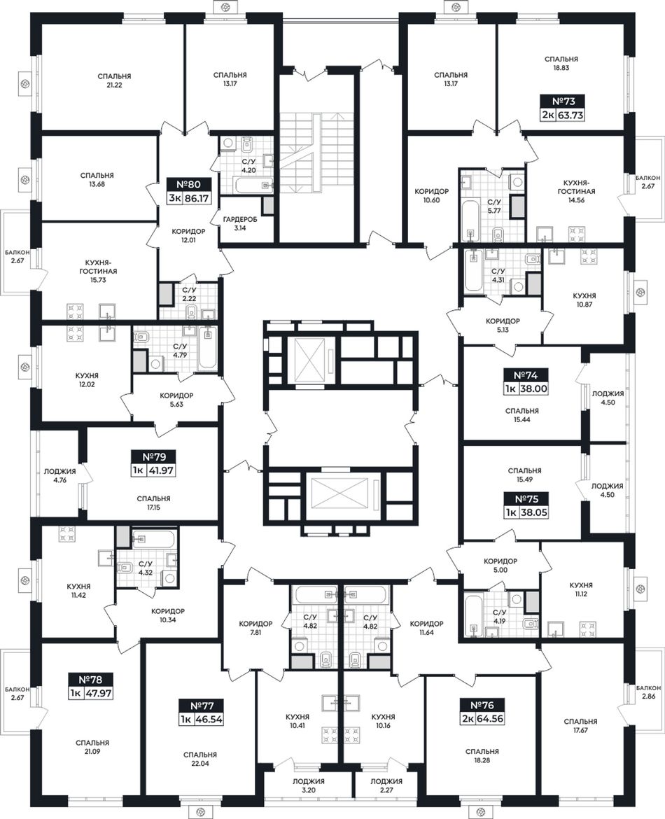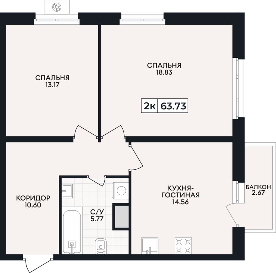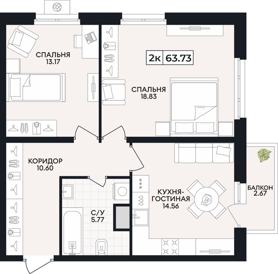 2-комнатная — 63,73 м² 12/15 эт. в Кипарис
