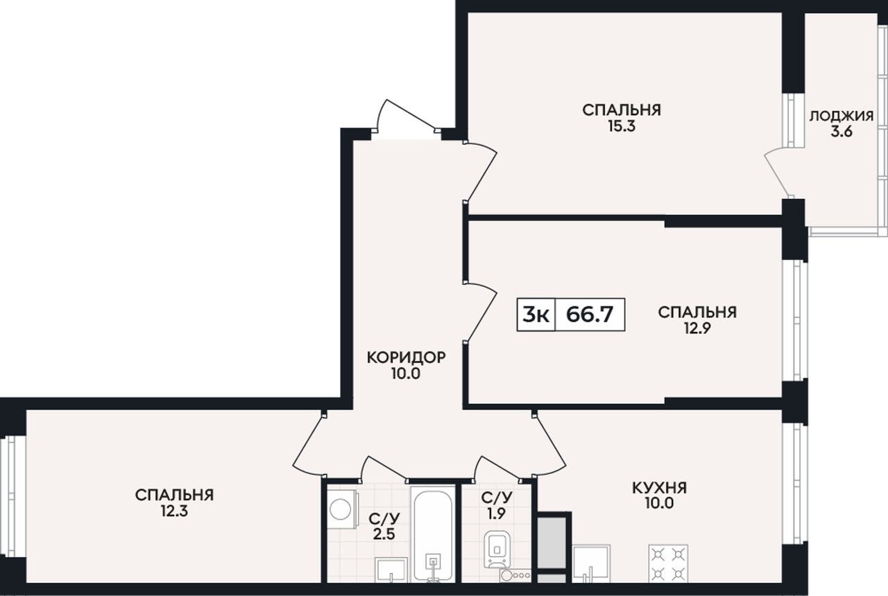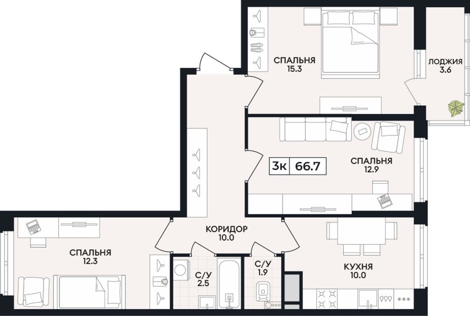 3-комнатная — 66,7 м² 6/9 эт. в Горизонт