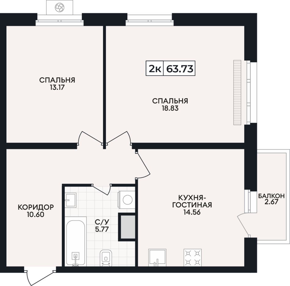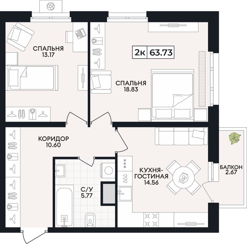 2-комнатная — 63,73 м² 14/15 эт. в Кипарис