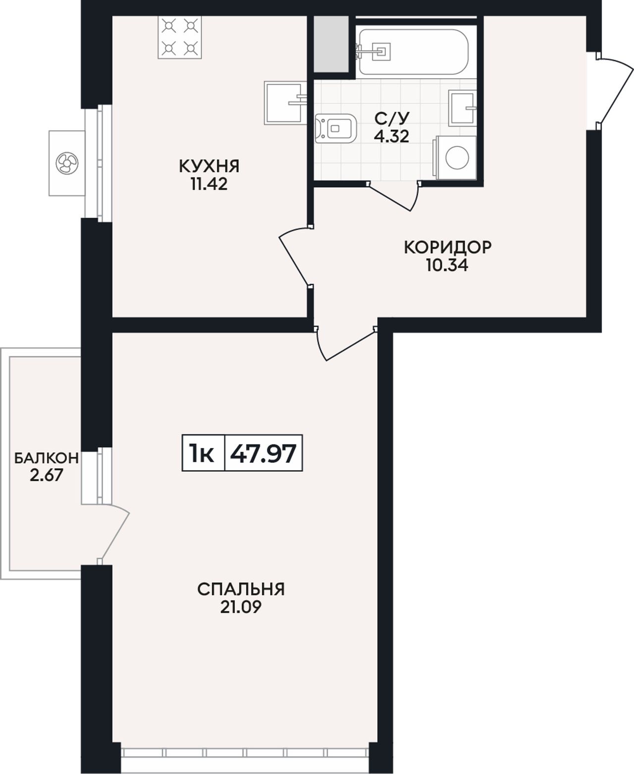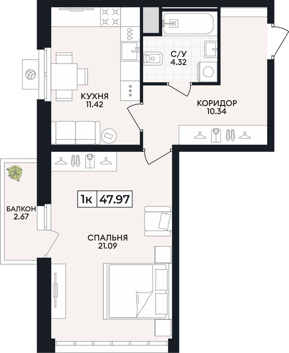 1-комнатная — 47,97 м² 8/15 эт. в Кипарис