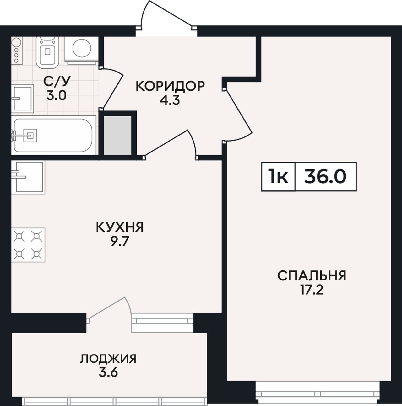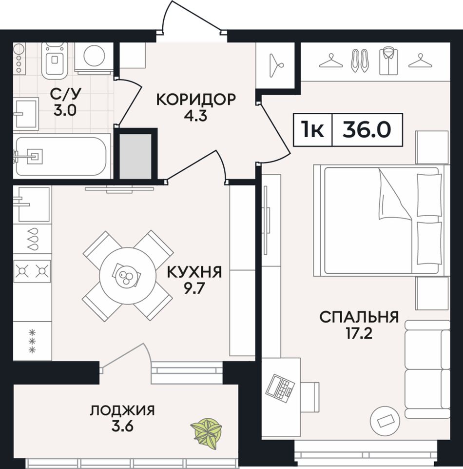 1-комнатная — 36 м² 9/9 эт. в Горизонт