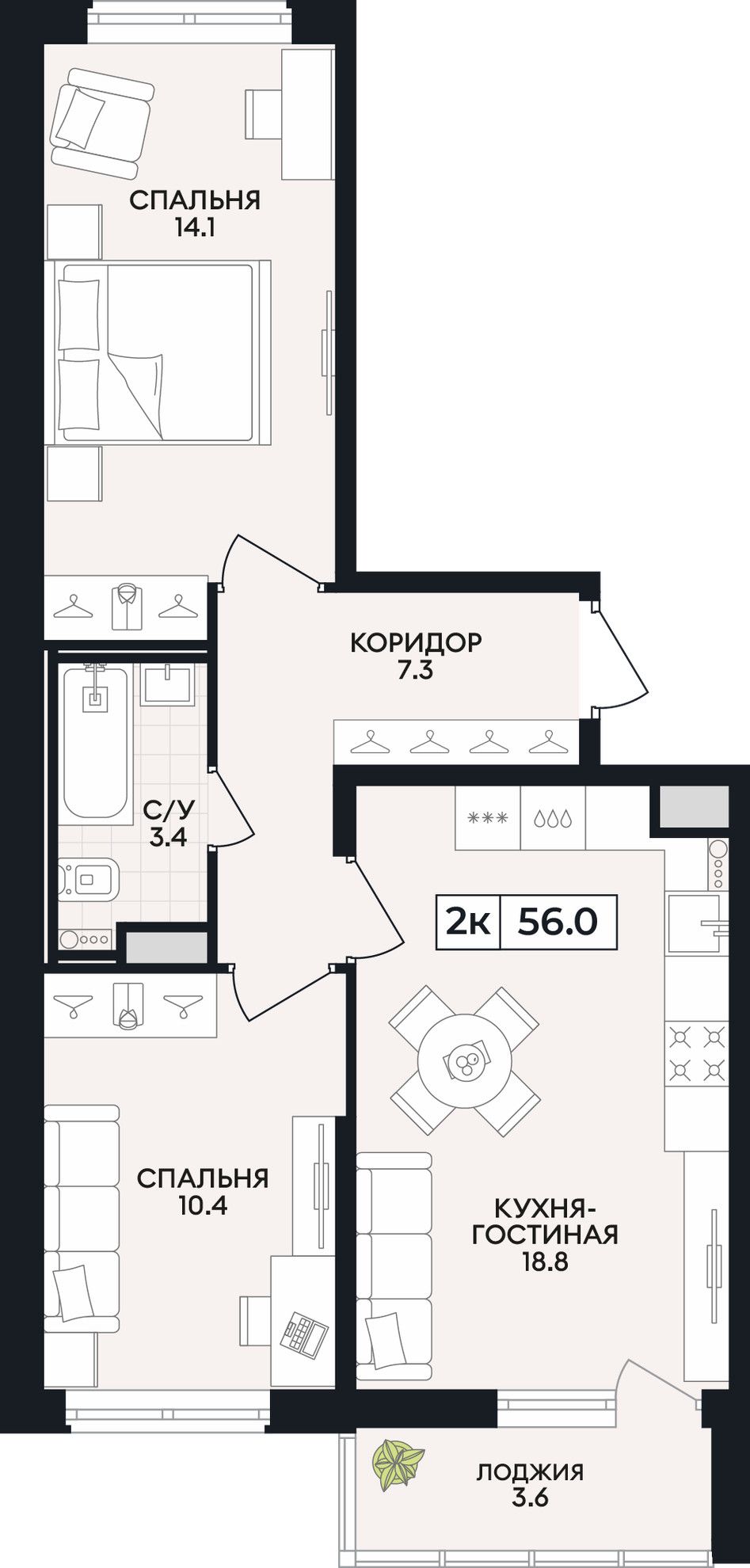2-комнатная — 56 м² 2/9 эт. в Горизонт